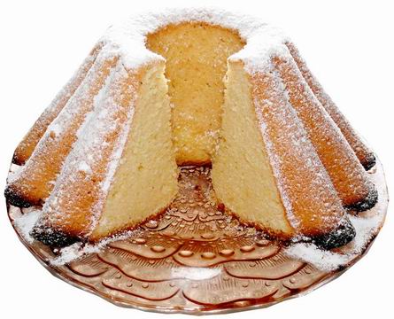 Do utartego masła porcjami dodawać żółtka ubite z cukrem na pianę. Potem, nadal ucierając, dodać skórkę cytrynową, drobno posiekane migdały, wlać rozpuszczone w ciepłym mleku drożdże, śmietanę, wsypać mąkę. Dodać pianę z białek ubitą ze szczyptą soli, ostrożnie wymieszać. Ciasto wyłożyć do wysmarowanych masłem lub margaryną form, wypełniając je do 1/3 wysokości. Przykryć czystą ściereczką i postawić w ciepłym miejscu. Gdy ciasto zwiększy swą objętość o 2/3, wstawić je do nagrzanego piekarnika i piec około godziny. Cukier puder utrzeć z sokami na gęstą gładką masę, dodać skórkę pomarańczową i takim lukrem polać ostudzoną babkę. 100 g -> 270 kcal.